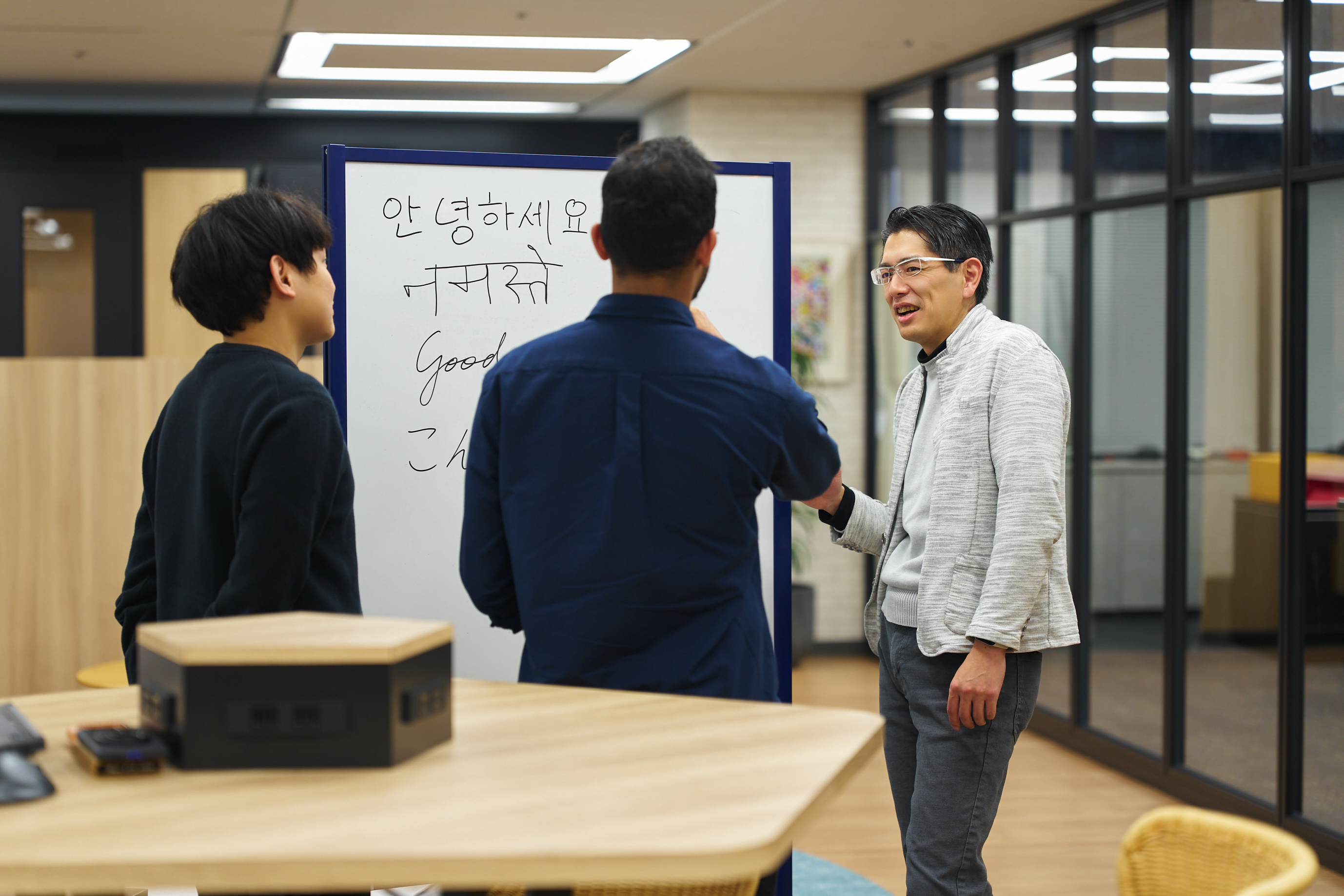 少し早めの8時半ごろに出社。この日は、ナイジェリア出身のメンバーと語学のミニ勉強会からスタート。日本語と英語をお互いに教え合う時間です。