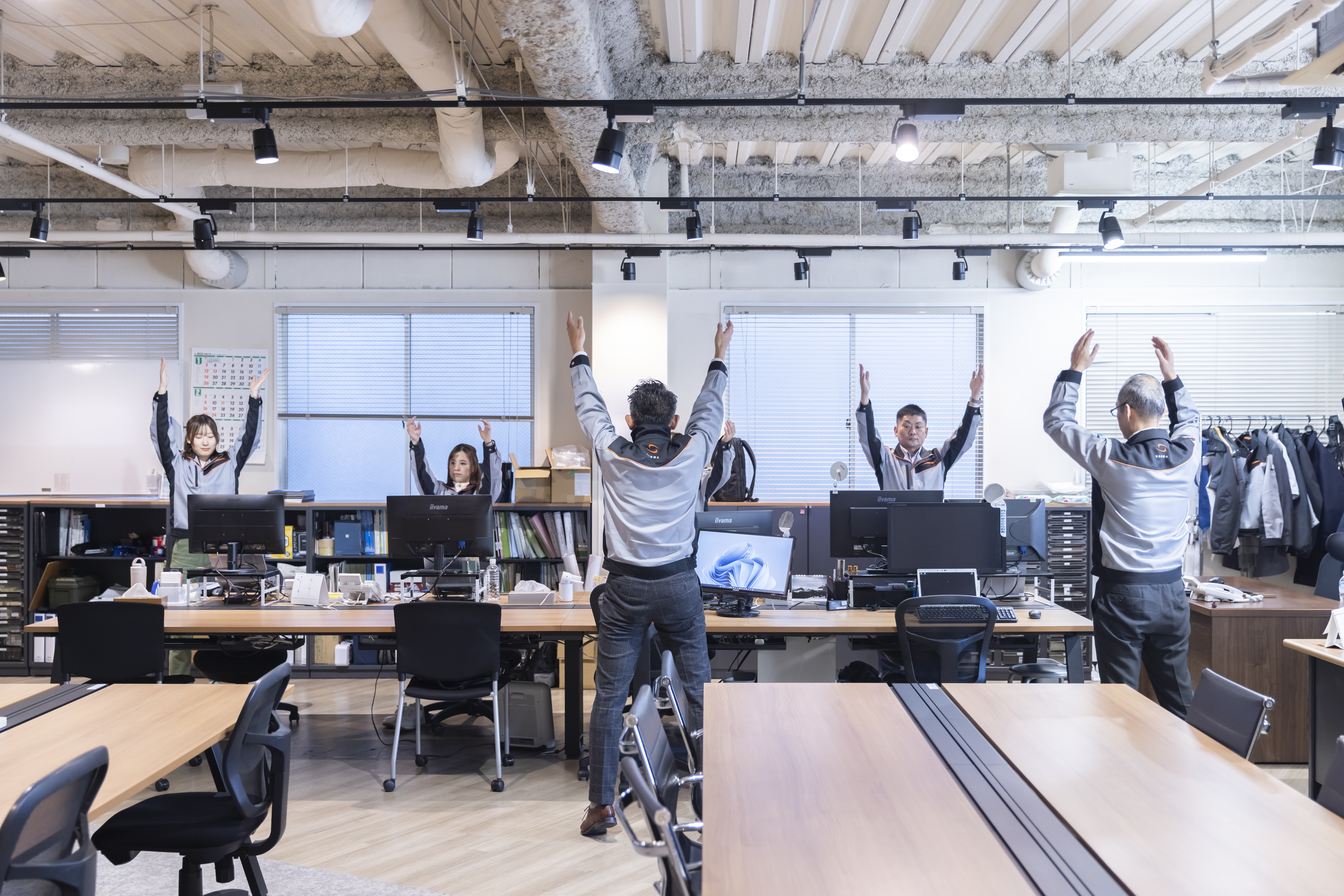 社員全員参加のラジオ体操から一日がスタート。その後、自分の席へ戻ってBIMチームで1日のスケジュールを確認し、お互いに情報を共有します。さらに、全社員が発信しているSNS型日報システム「SODA(ソーダ)」のチェックも。「ときどき社長からコメントが来ているとドキッとします(笑)」。