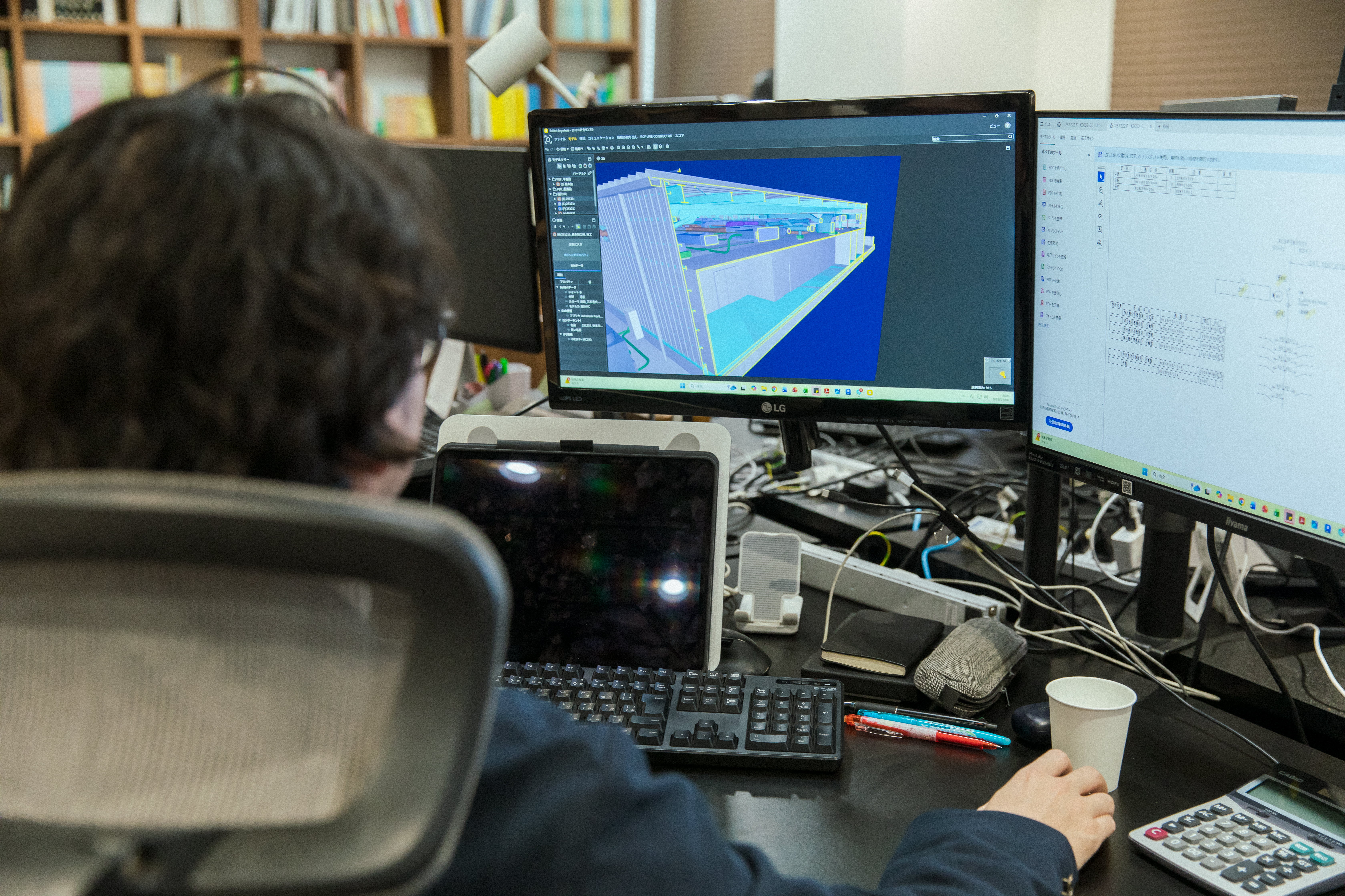 BIMを活用するための社内ガイドラインを整備するのがBIMチームの役割の一つ。三和建設の標準となるオブジェクトを作成し、誤りや修正事項がないか一つひとつ確認していきます。また、BIMに関する教育係も担っていて、時には、設計メンバーにBIMツールの使い方などをレクチャーすることも。