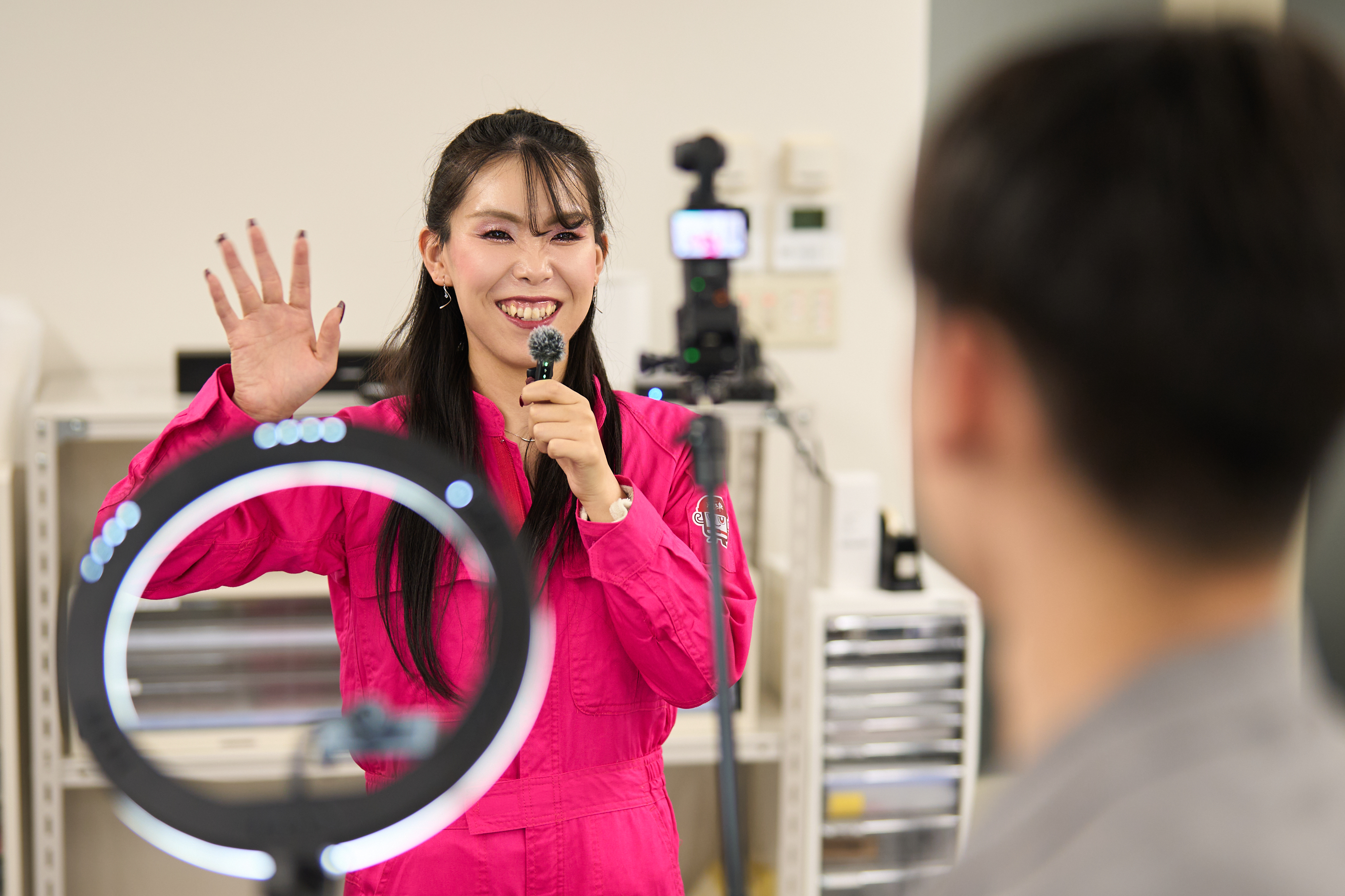 ピンクのつなぎの衣装に着替え、渡された台本に目を通し、セリフを覚えたら「西園寺りょう」として撮影スタート!