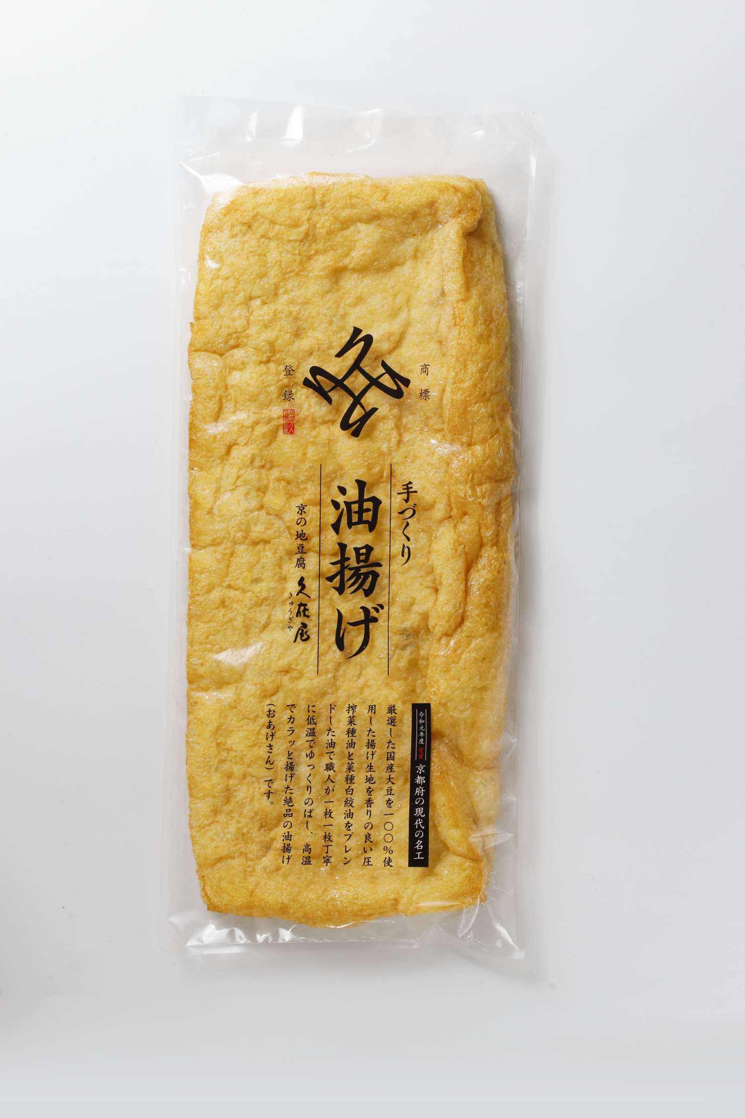 国産大豆の生地を菜種油(赤〆と白〆油のブレンド)を低温で伸ばし工程、高温でカラシ工程(カラシ工程とは高温で生地を形成し色と香が出てくる高温で揚げる手法)で一枚一枚手揚げで製造しているお揚げさんです。お料理には油抜きせずにお使いください。焼いて食べるとふんわり・パリッと香ばしい食感が楽しめます。お揚げさんには色にムラがありますが、それも手揚げならではの魅力です。