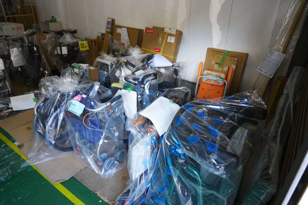 会社1階の倉庫には車椅子や手すりなどがたくさん。
