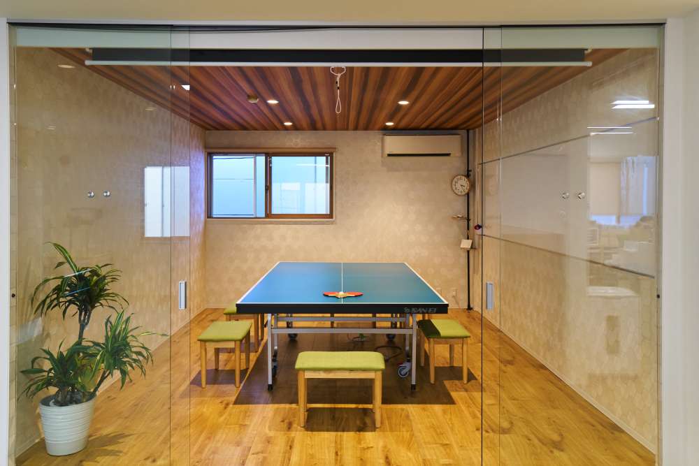 卓球台の会議テーブルがおしゃれ。