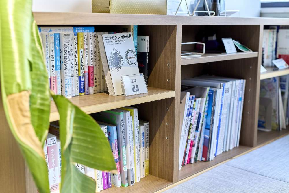 ゆっくりできる畳スペースの傍らには、建築に関わる書籍が並ぶ。