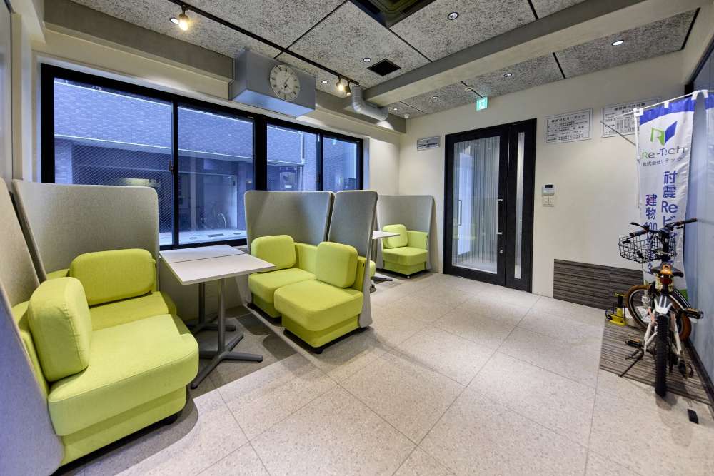 会社の入り口にはカラフルな椅子のおしゃれな打ち合わせスペース。