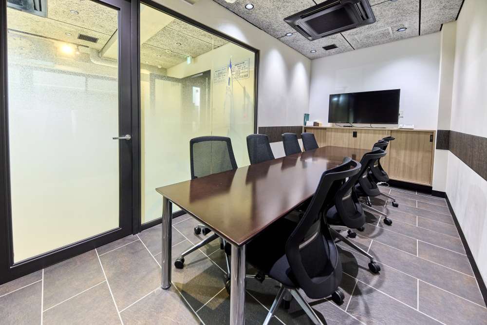 入り口横の会議室は、シックな色合いの落ち着いたスペース。
